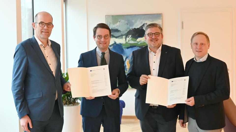 „Diese Projekte zeigen eindrucksvoll, wie wissenschaftlicher Fortschritt, regionale Kooperation und ein klarer Fokus auf Klimaschutz zusammenwirken können. Ich freue mich sehr, dass wir diesen wichtigen Transformationsprozess mit zwei Förderbescheiden unterstützen können“, betonte Regierungspräsident Andreas Bothe heute (28. November) bei der Übergabe der Zuwendungsbescheide in den Räumen der Bezirksregierung in Münster.
