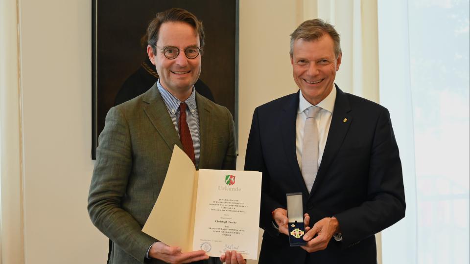 Münster/Recklinghausen. Regierungspräsident Andreas Bothe hat gestern (14. Juli) Christoph Tesche, den Bürgermeister der Stadt Recklinghausen, mit dem Brand- und Katastrophenschutz-Verdienst-Ehrenzeichen in Silber geehrt.