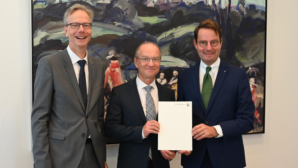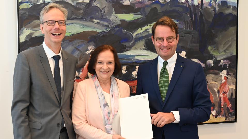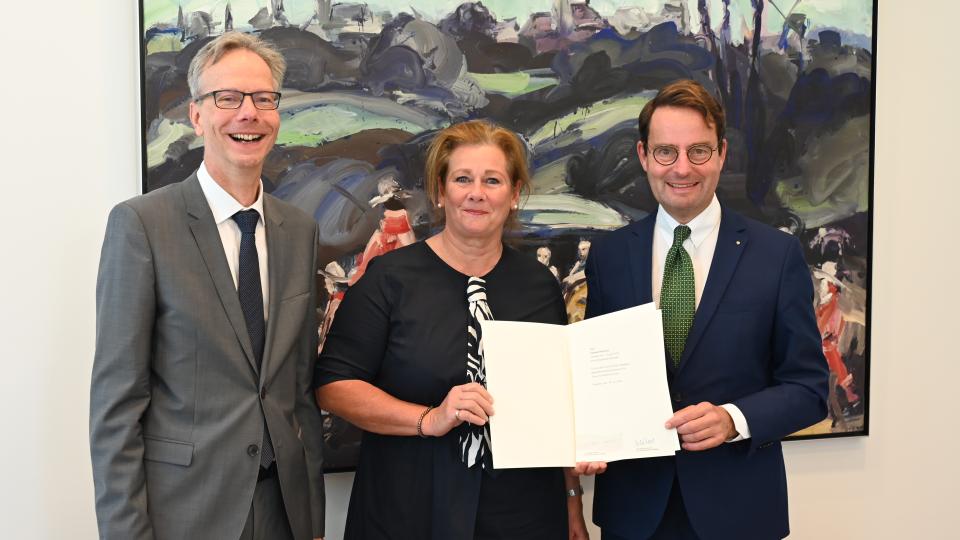 Münster. Drei langjährige Beschäftigte der Bezirksregierung Münster wurden jetzt für ihre Treue und ihren Einsatz im öffentlichen Dienst geehrt. Regierungspräsident Andreas Bothe und Regierungsvizepräsident Dr. Ansgar Scheipers gratulierten Sonja Smodis, Gabriele Rottmann und Ralf Weidmann gestern (29. September) herzlich zu diesem besonderen Anlass. Während einer Feierstunde überreichten sie die Jubiläumsurkunden mit den besten Glückwünschen.