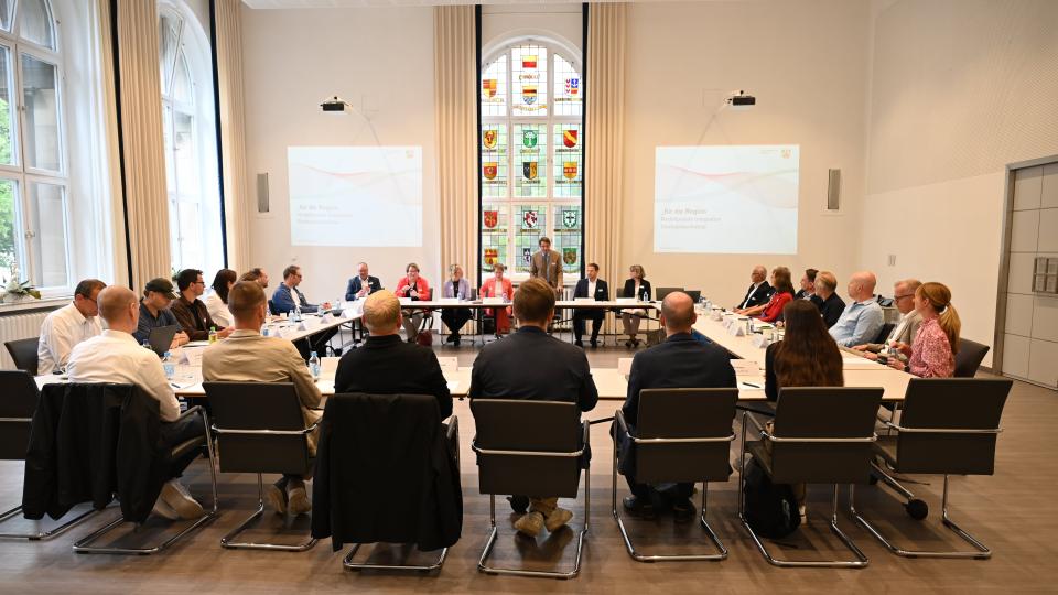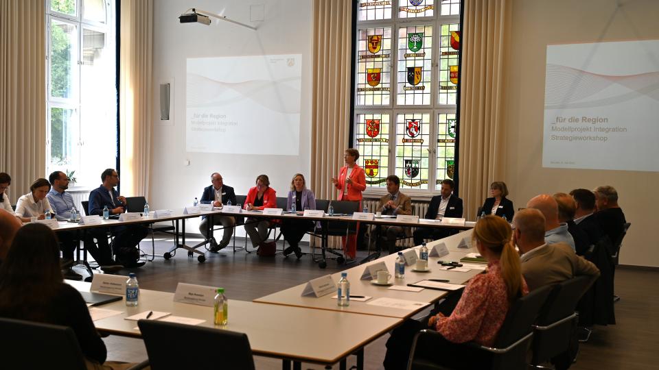 Münster. Das „Modellprojekt Integration“ unterstützt seit Oktober 2024 geflüchtete Menschen in der Zentralen Unterbringungseinrichtung (ZUE) Münster mit gezielten Angeboten. Gestern (09. Juli) trafen sich die Projektpartner:innen auf Leitungsebene in den Räumen der Bezirksregierung Münster zu einem Strategieworkshop.