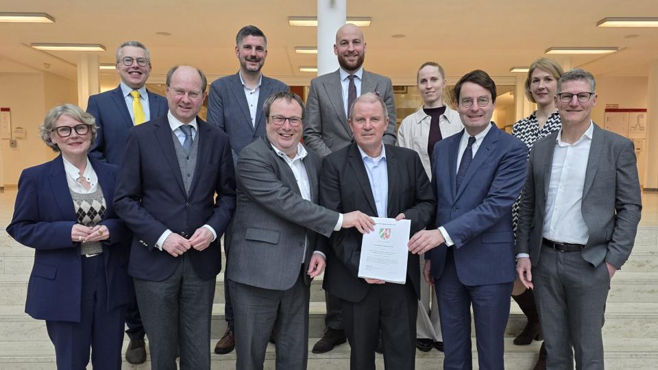 Im Bild: NRW-Verkehrsminister Oliver Krischer (3.v.l.) und Regierungspräsident Andreas Bothe (5.v.l) übergeben den Planfeststellungsbeschluss an den WLE-Geschäftsführer, Detlef Berndt (4.v.l.). Mit ihm freuen sich (vordere Reihe v.l.) die Geschäftsführerin des NWL, Christiane Auffermann, der Landrat des Kreises Warendorf, Dr. Olaf Gericke und der Münsteraner Oberbürgermeister, Tilman Fuchs (r.). In der hinteren Reihe (v.l.) der Verbandsvorsteher des ZVM, Dr. Linus Tepe, Nils Winter vom NWL, Michael Ottmann vom Kreis Warendorf, Christina Krüger von der WLE sowie die Bürgermeisterin der Stadt Sendenhorst, Katrin Reuscher.