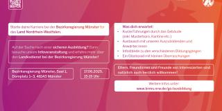 Bezirksregierung Münster 20.11.2025 Pressemitteilung Neue Podcast-Folge: „Komm zu uns ins Team! Ausbildung bei der Bezirksregierung Münster“ Wie ist es eigentlich, bei der Bezirksregierung Münster zu arbeiten? Welche Ausbildungsberufe gibt es und warum lohnt sich eine Ausbildung oder ein duales Studium hier besonders?