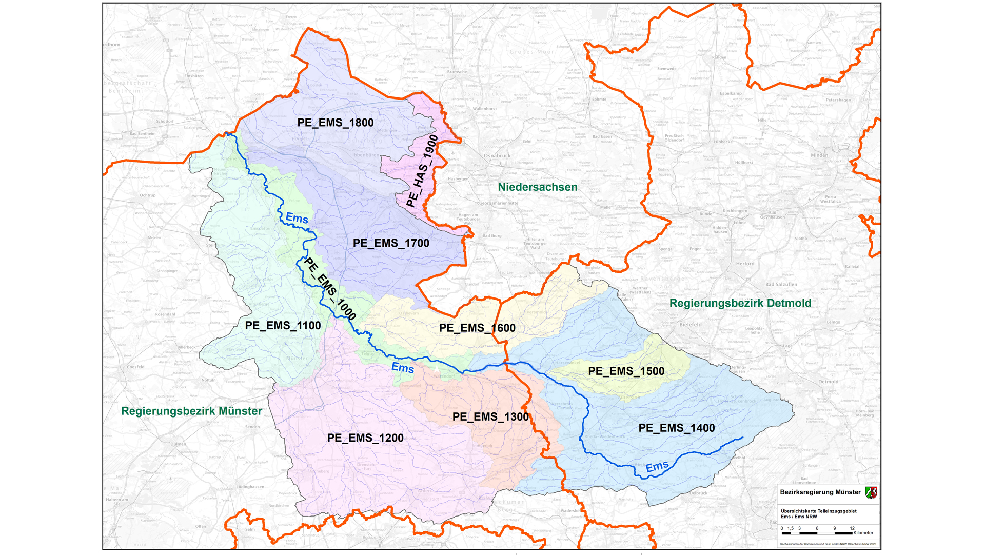 Übersicht über das Teileinzugsgebiet Ems NRW mit zugehörigen Planungseinheiten. / ©Bezirksregierung MünsterÜbersicht über das Teileinzugsgebiet Ems NRW mit zugehörigen Planungseinheiten.