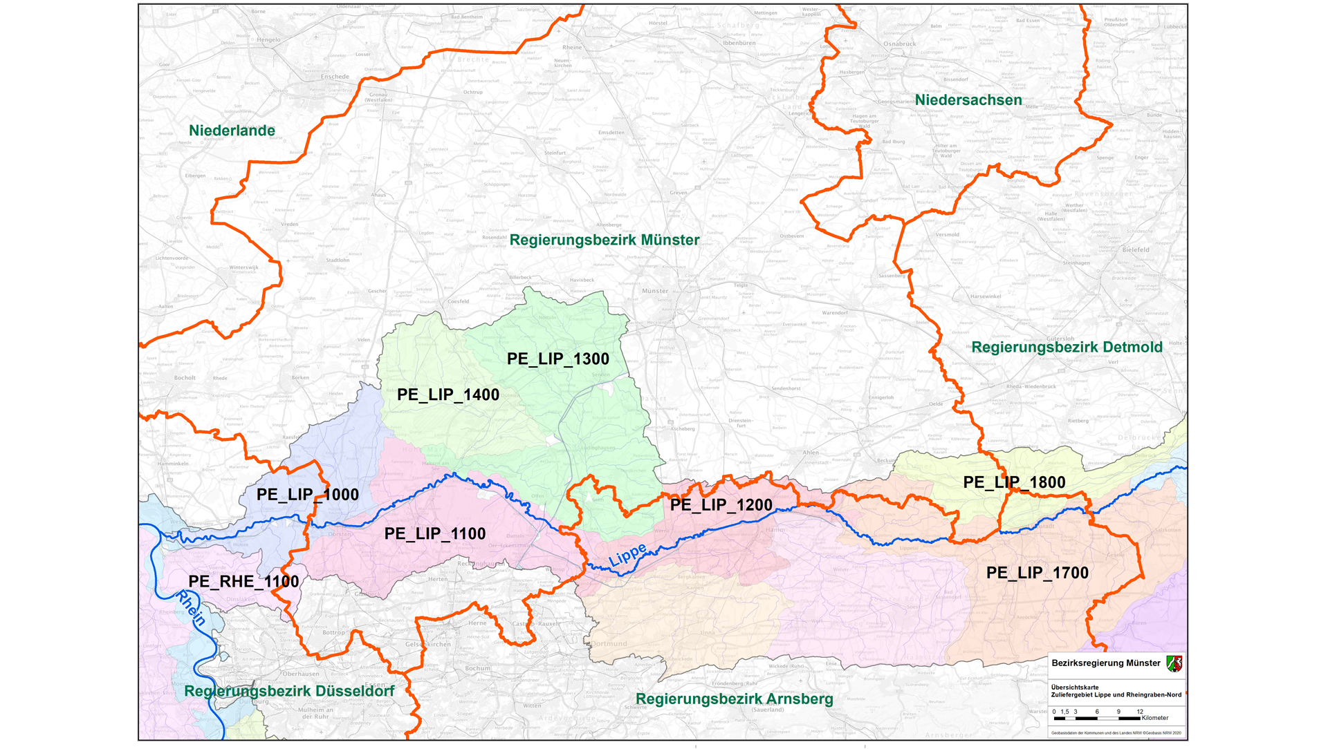 Übersicht über das Zuliefergebiet Lippe und Rheingraben-Nord mit zugehörigen Planungseinheiten. / ©Bezirksregierung MünsterÜbersicht über das Zuliefergebiet Lippe und Rheingraben-Nord mit zugehörigen Planungseinheiten.