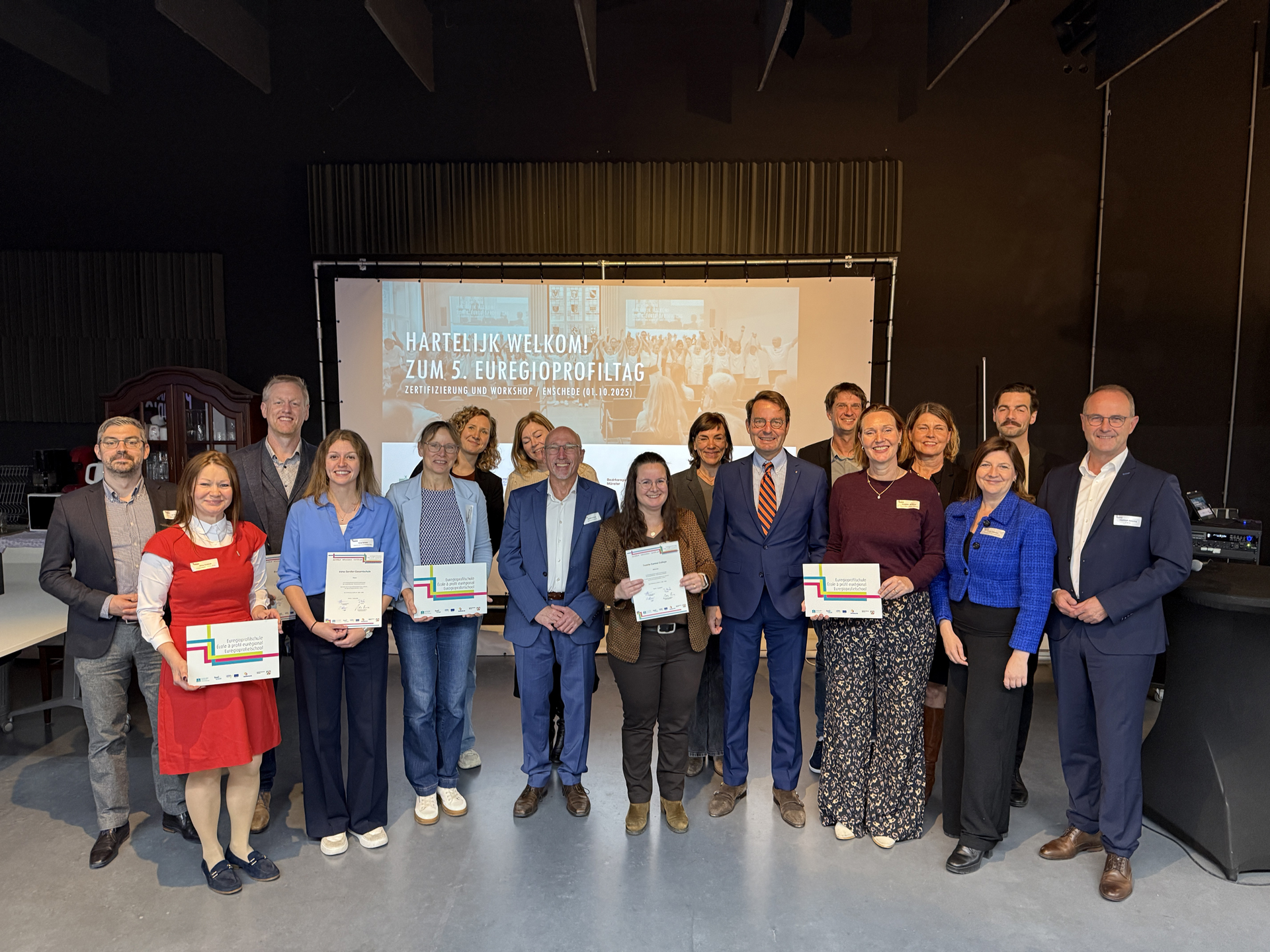 (v.l.) Christoph Almering (EUREGIO), Jo Sterkx (nl Taalunie), Christian Schroll (Anne-Frank-Gesamtschule), Melanie Nowack (Anne-Frank-Gesamtschule), Regierungspräsident Andreas Bothe, Trixie Hölsgens (Duitsland Instituut Amsterdam), Stephan Krems / ©Bezirksregierung Münster