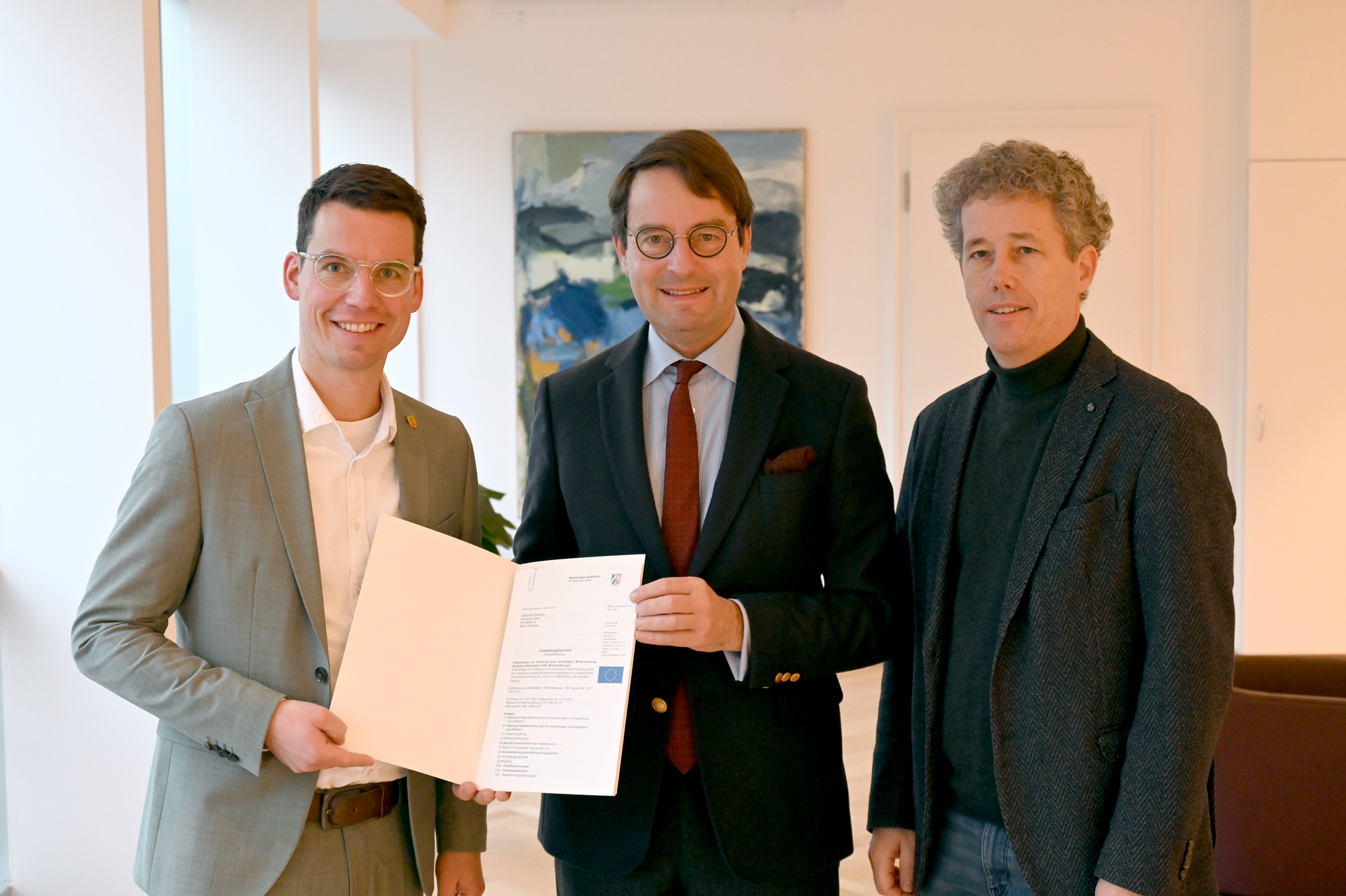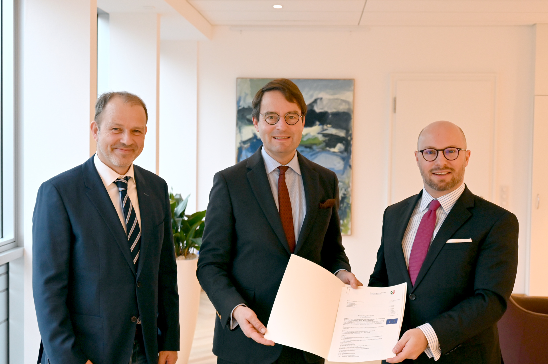 Regierungspräsident Andreas Bothe (M.) übergibt den Förderbescheid an Altenberges Bürgermeister Jan Röschenkämper (l.) und Christoph Rövenkamp, Fachbereichsleiter des Bauwesens und der Liegenschaft. / ©Bezirksregierung Münster