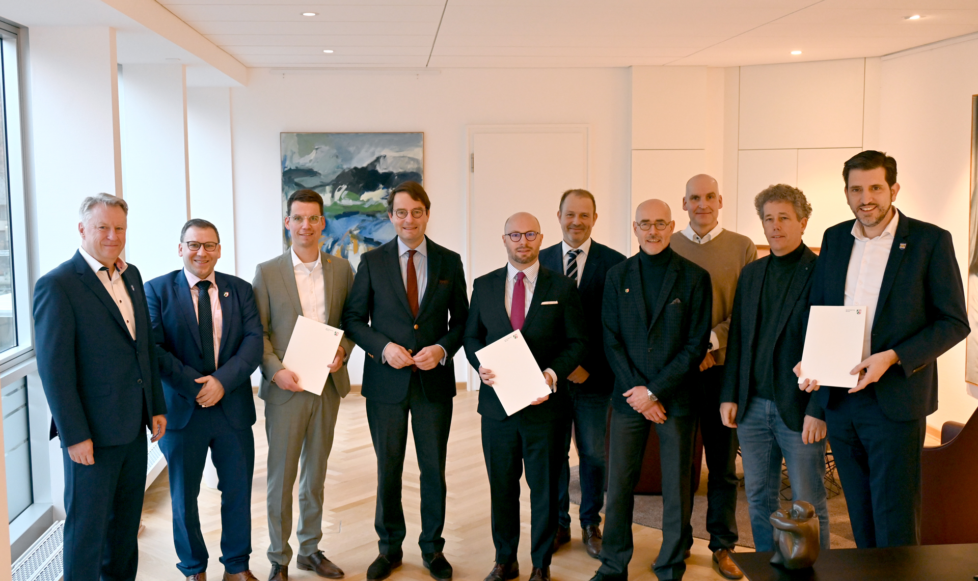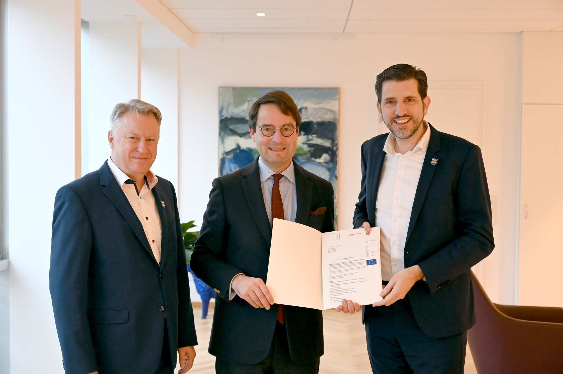 Regierungspräsident Andreas Bothe (M.) übergibt den Förderbescheid an Beckums Bürgermeister Michael Gerdhenrich (r.) und Horst Schenkel, Fachdienstleiter des Tiefbaus. / ©Bezirksregierung Münster