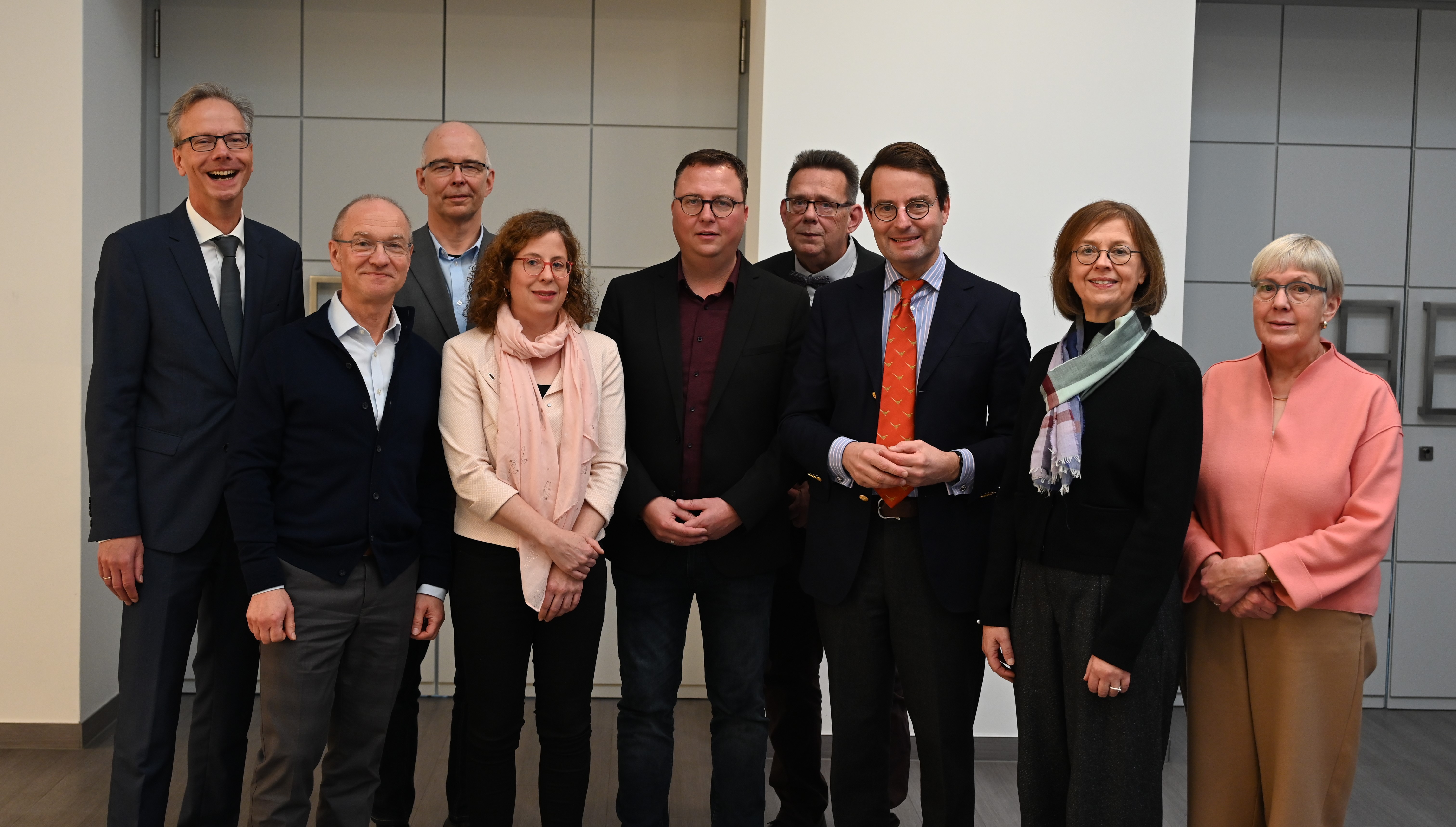 Regierungsvizepräsident Dr. Ansgar Scheipers, Ralf Weidmann, Karl-Gerhard Strucksberg, Patrizia Lubitz, Markus Nowak, Frank Gildemeyer, Regierungspräsident Andreas Bothe, Christiane Wienströer und Dr. Christel Wies / ©Bezirksregierung Münster