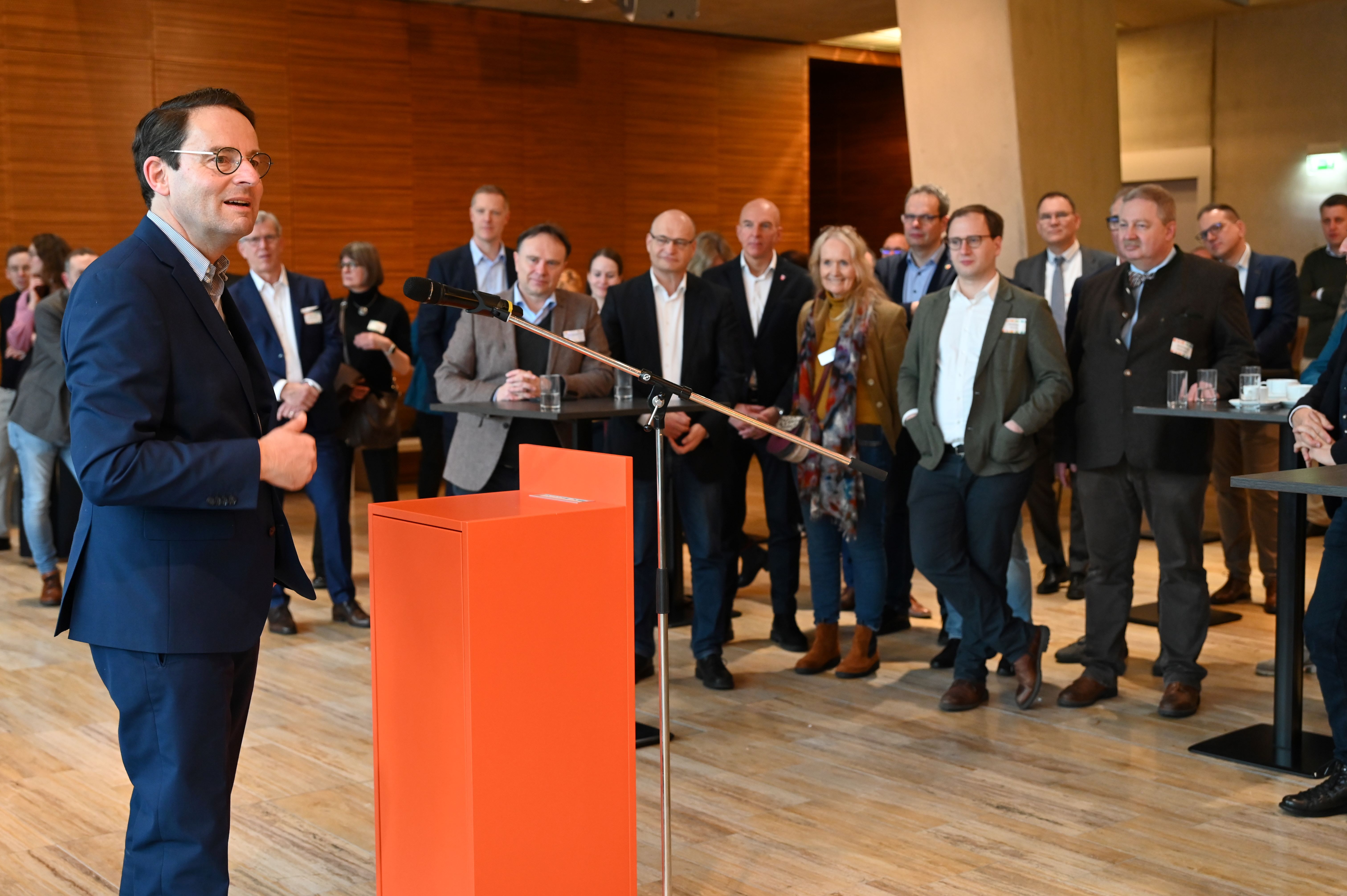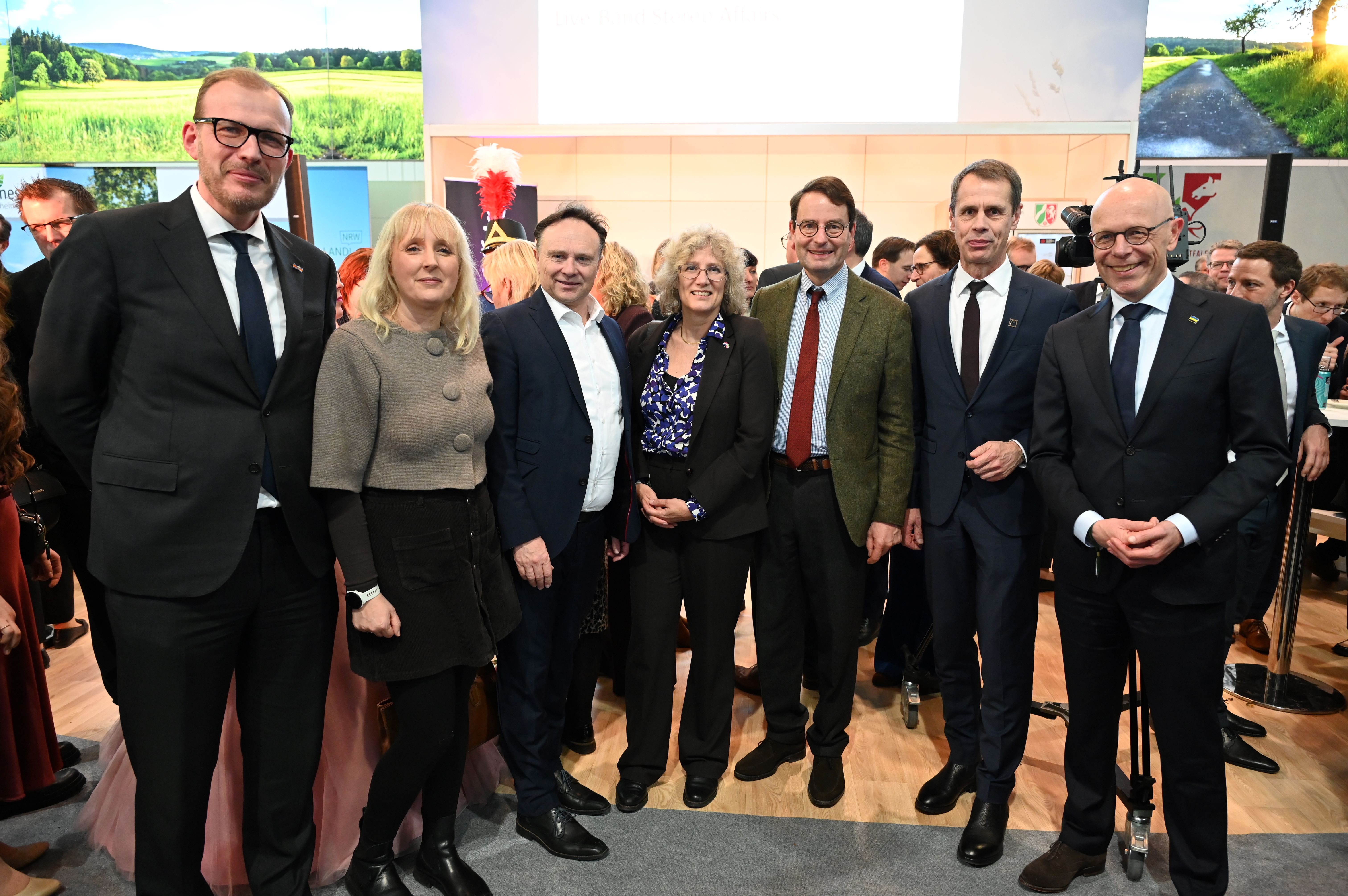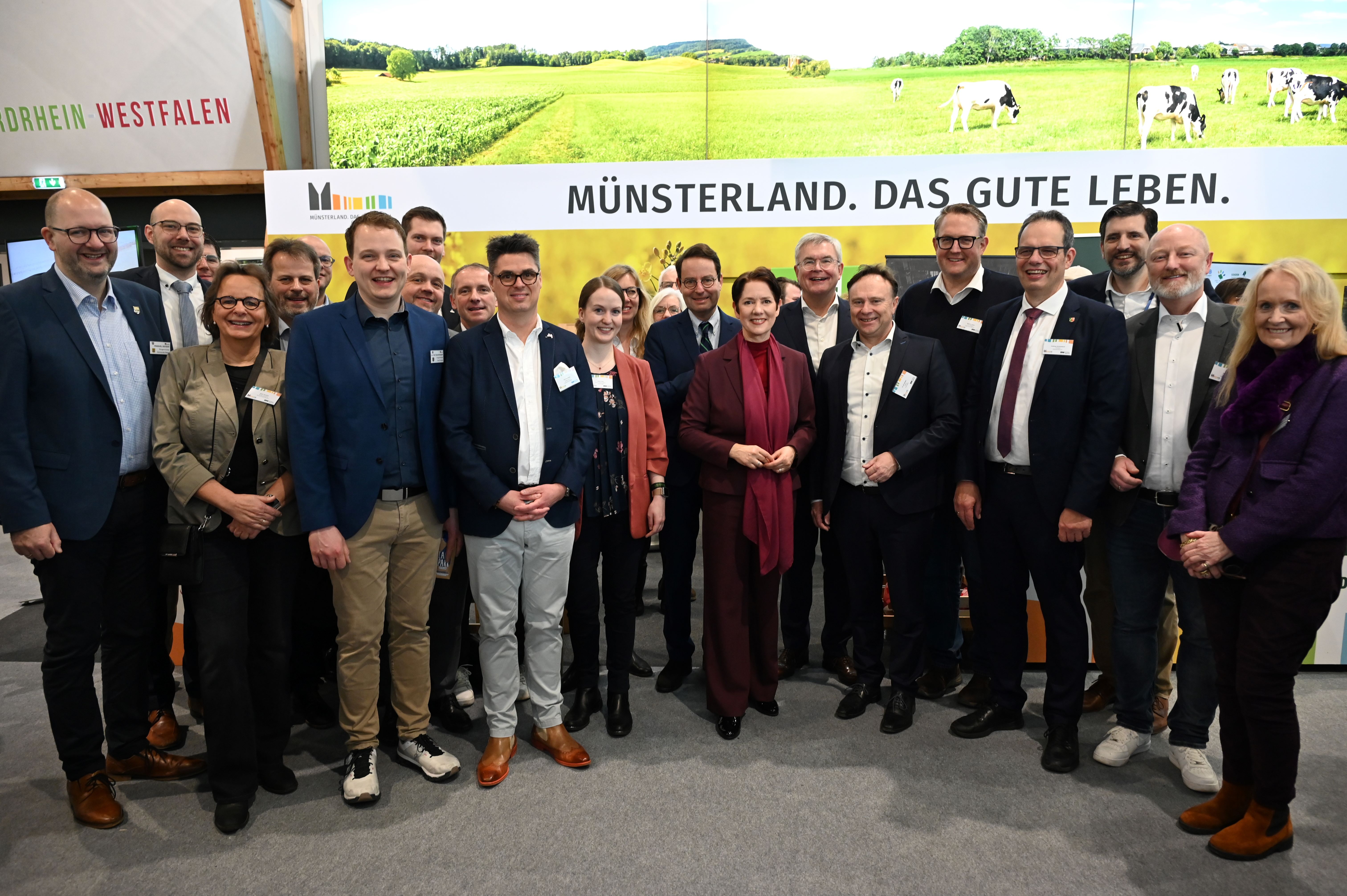 Die Gruppe aus dem Münsterland, zu der u.a. auch die Ministerin für Landwirtschaft und Verbraucherschutz, Silke Gorißen (8.v.r.), Regierungspräsident Andreas Bothe (9.v.r.) und der Vorsitzende des Münsterland e.V., Andreas Grotendorst (4.v.r.) gehört, haben sich vor einem Bild mit dem Münsterlandmotto zum Gruppenfoto aufgestellt.