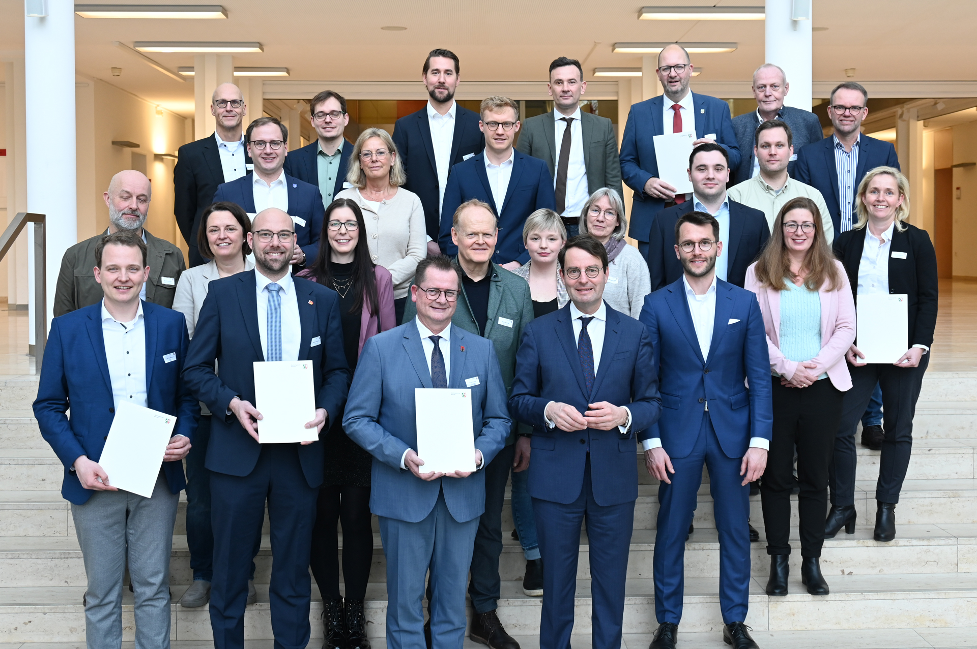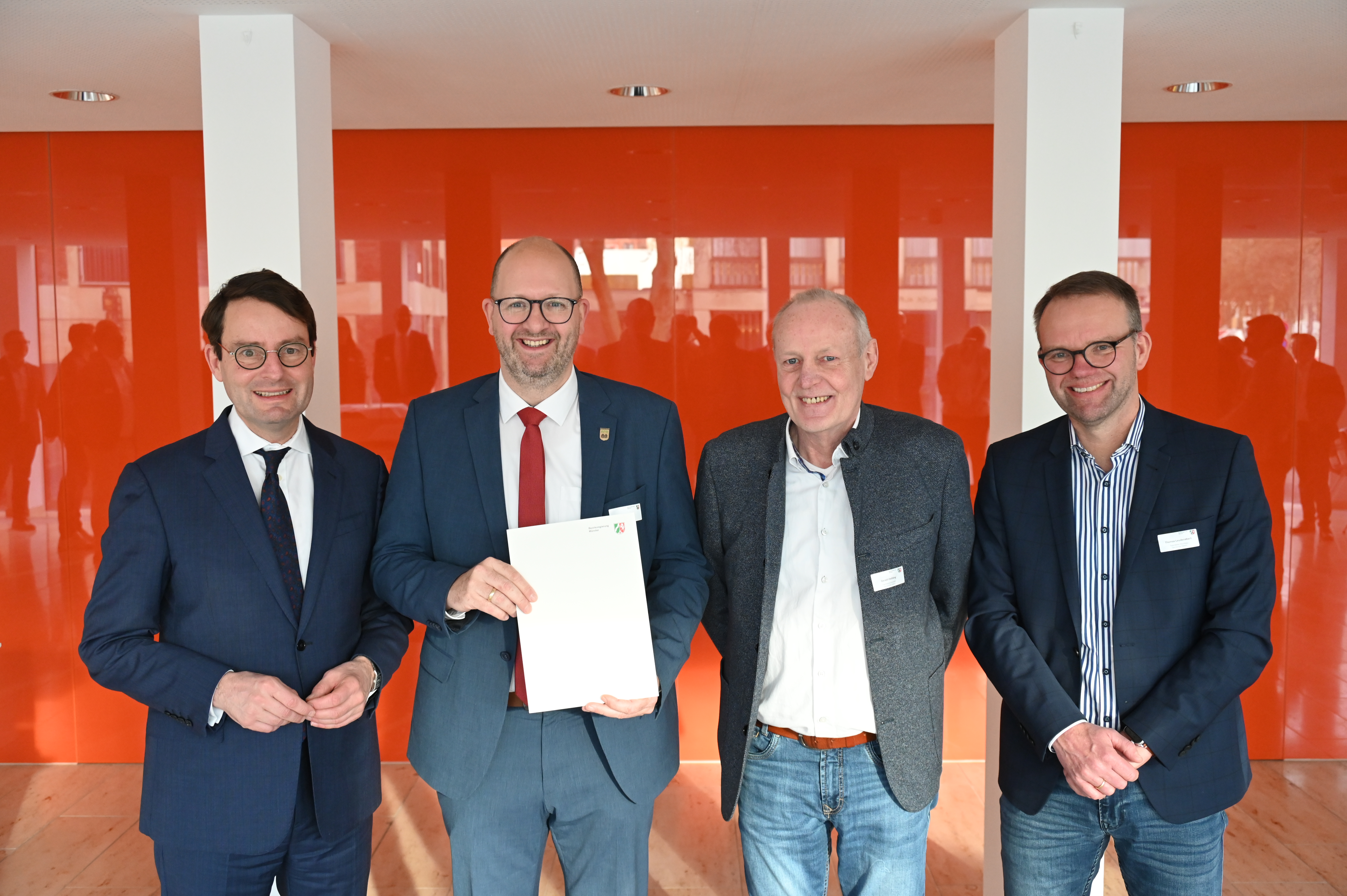 Regierungspräsident Andreas Bothe (l.) überreicht den Förderbescheid an Dietrich Aden (2.v.l.), Bürgermeister der Stadt Greven, Simon Werning (2.v.r.) und Volker Walkenfort (r.). / ©Bezirksregierung Münster