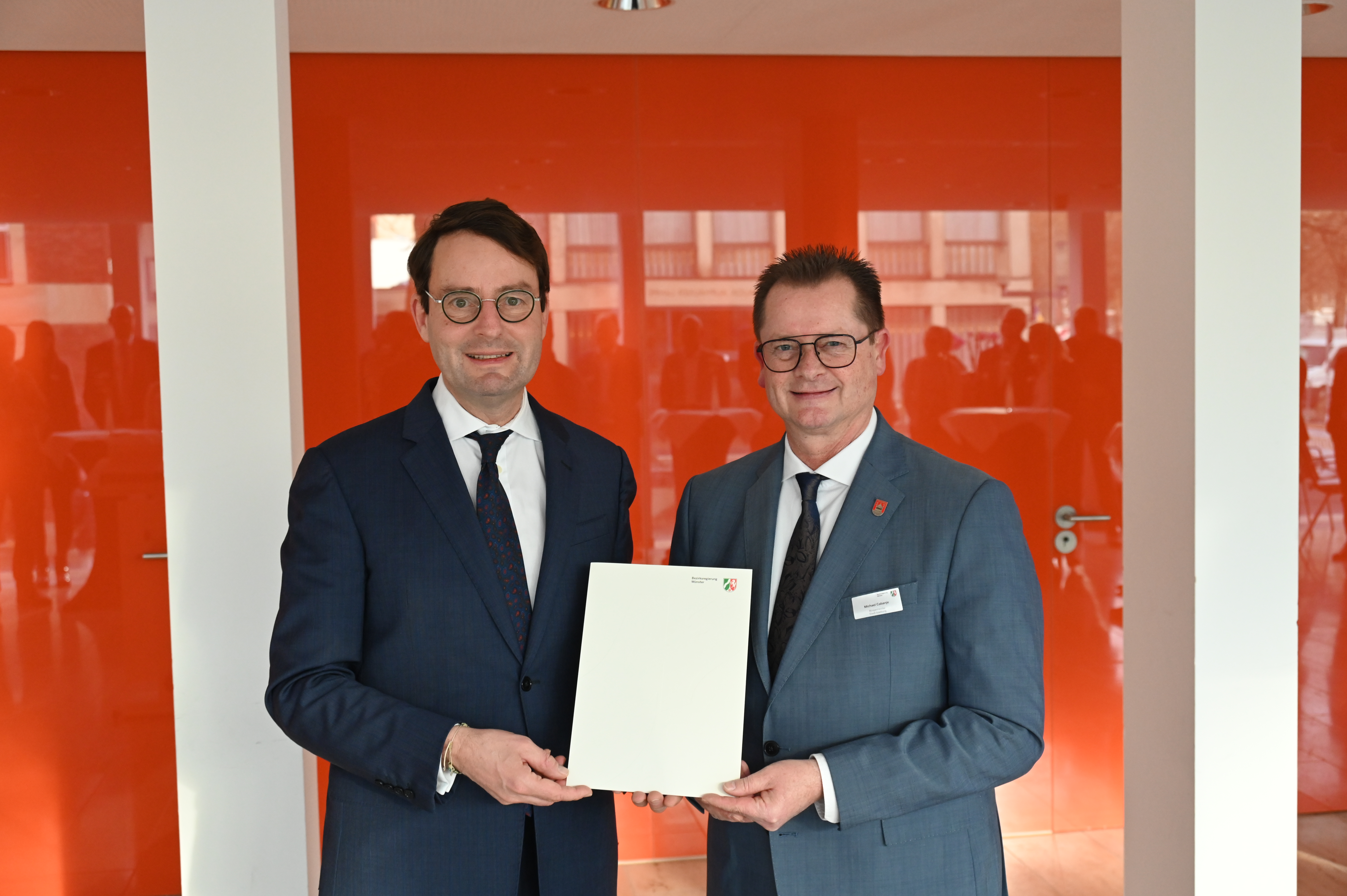 Regierungspräsident Andreas Bothe (l.) überreicht den Förderbescheid an Michael Cabanje (r.), Bürgermeister der Stadt Isselburg. / ©Bezirksregierung Münster