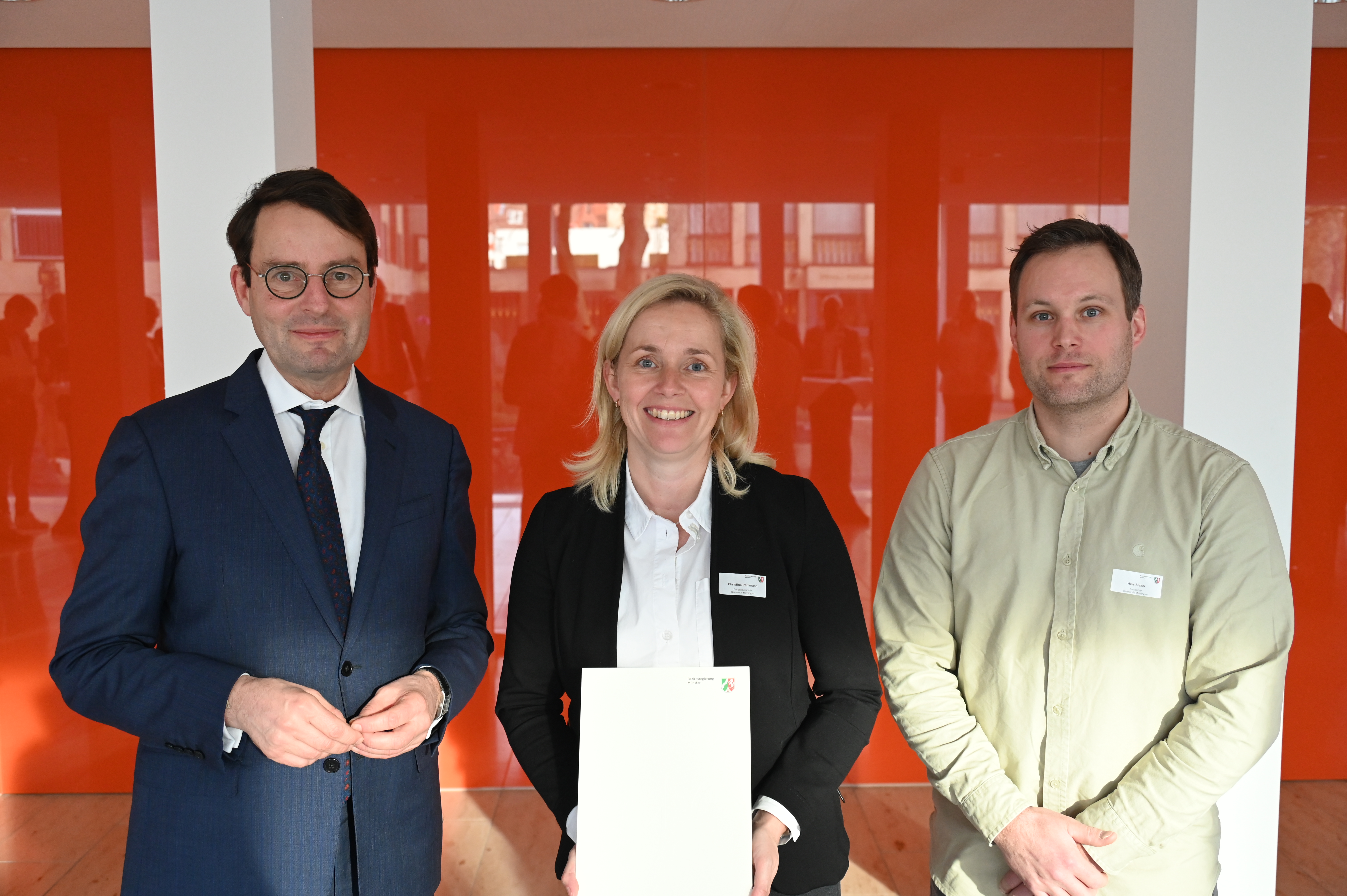 Regierungspräsident Andreas Bothe (l.) überreicht den Förderbescheid an Christina Rählmann, Bürgermeisterin der Gemeinde Mettingen, und Felix Sieker (r.). / ©Bezirksregierung Münster