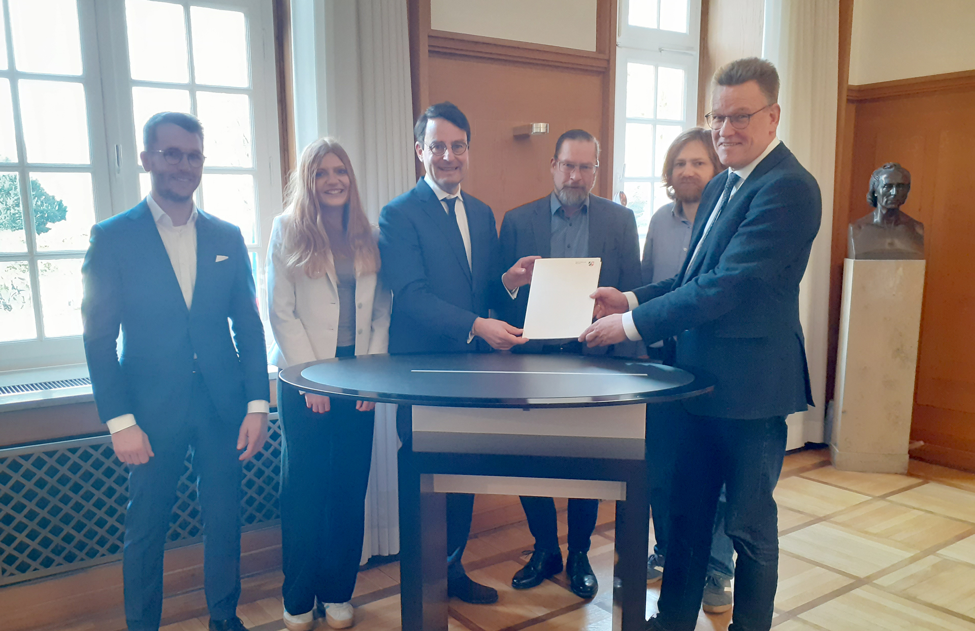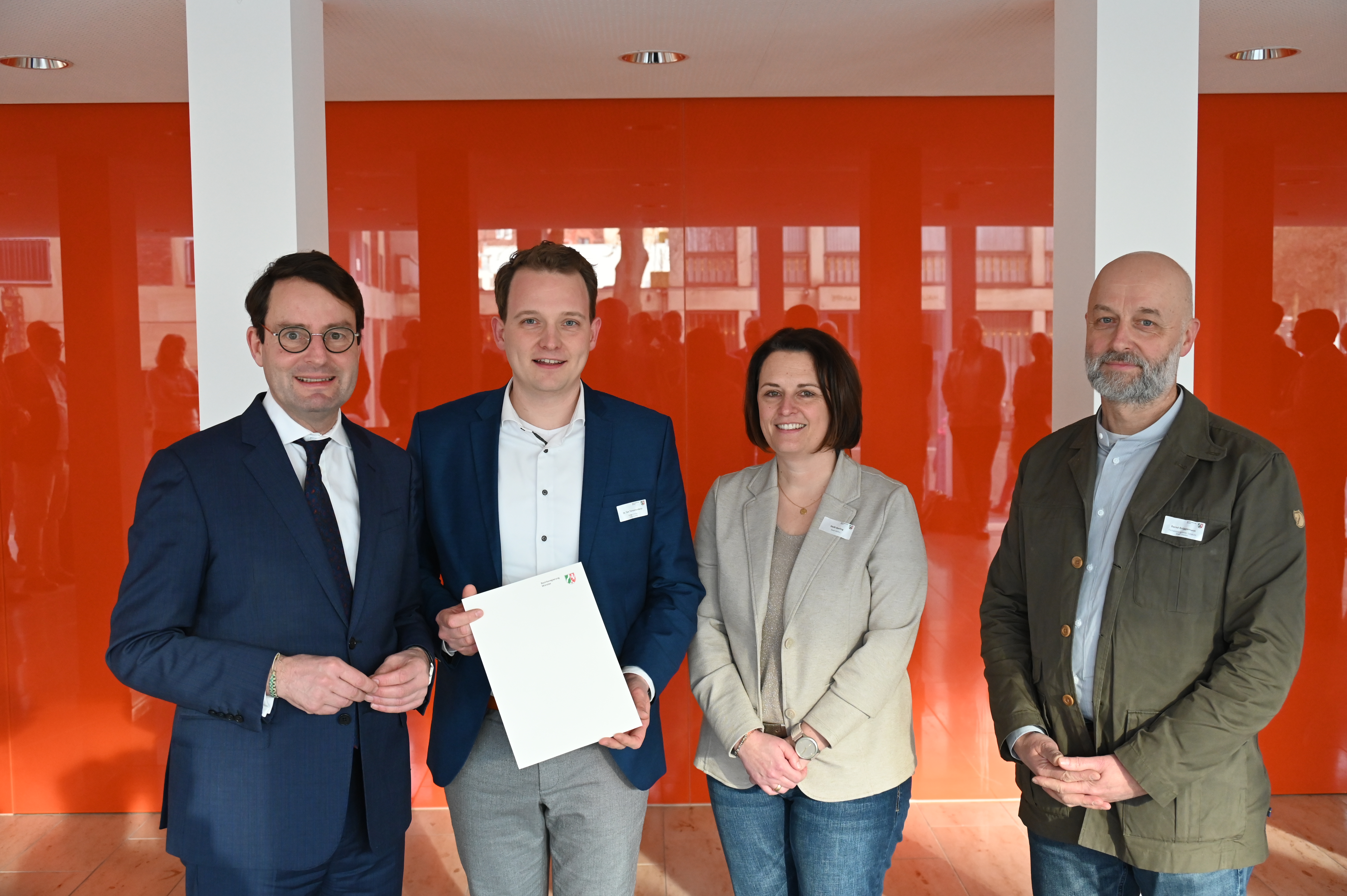 Regierungspräsident Andreas Bothe (l.) überreicht den Förderbescheid an Dr. Tom Tenostendarp (2.v.l.), Bürgermeister der Stadt Vreden, Steffi Beuting und Bernd Brüggemann (r.). / ©Bezirksregierung Münster