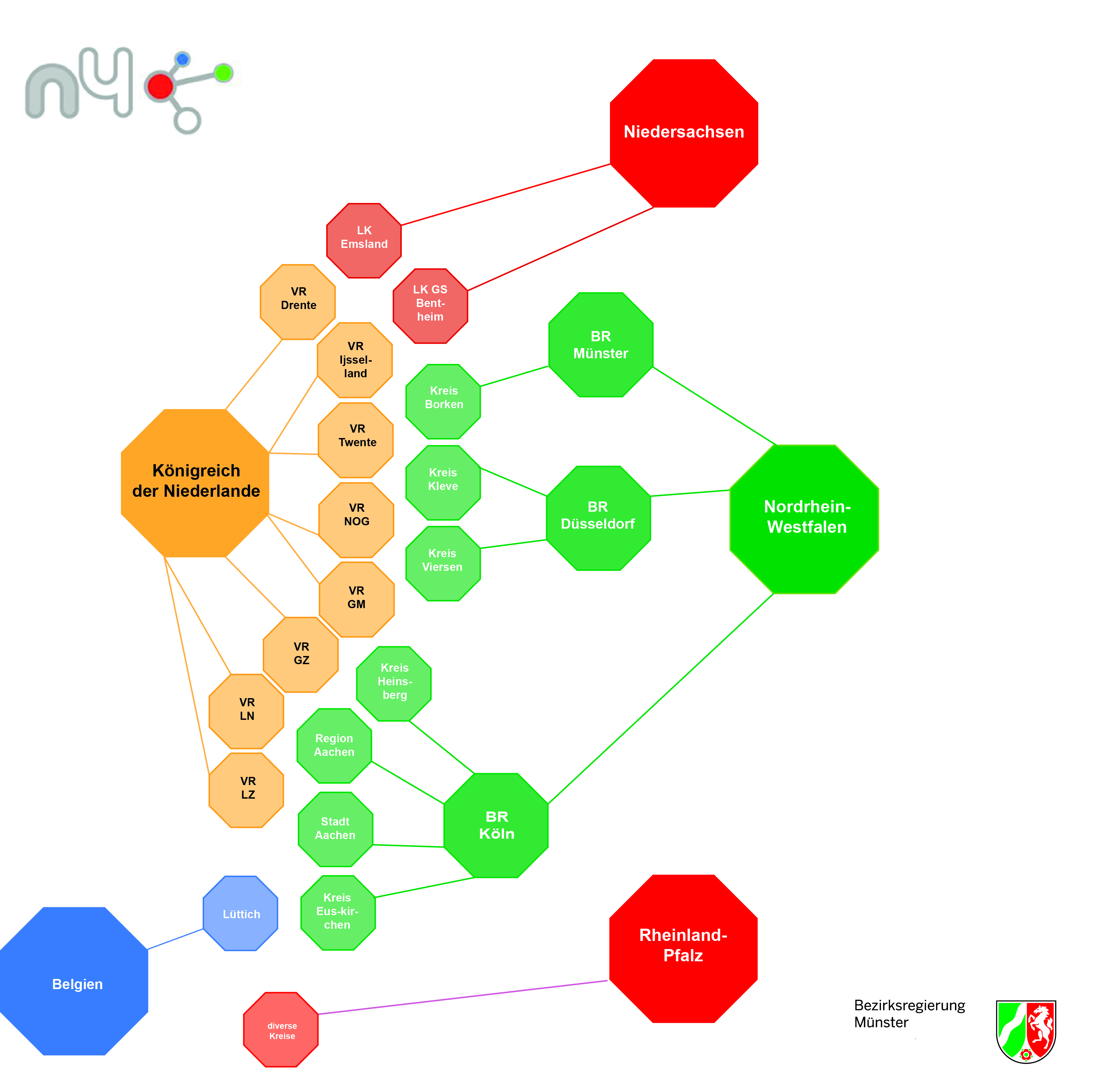 Das im September 2021 gegründete Netzwerk (N4 steht für das Netzwerk Niederlande und NRW Nichtpolizeiliches Krisenmanagement) und ist eine Arbeitsgemeinschaft zwischen verantwortlichen Partnern der grenznahen niederländischen Sicherheitsregionen und den deutschen Kreisen und den kreisfreien Städten. Unterstützt werden sie von den Bezirksregierungen und weiteren Partnern sowie den niederländischen Kommissaren des Königs.