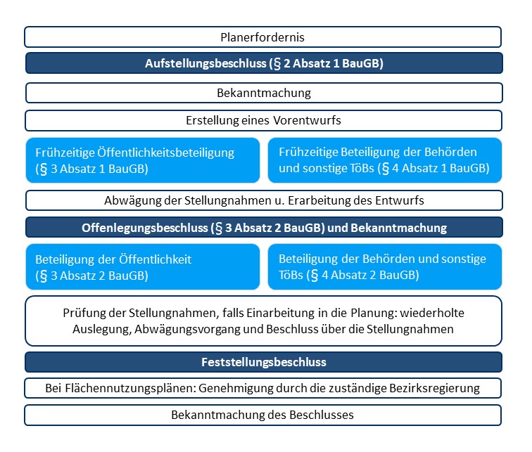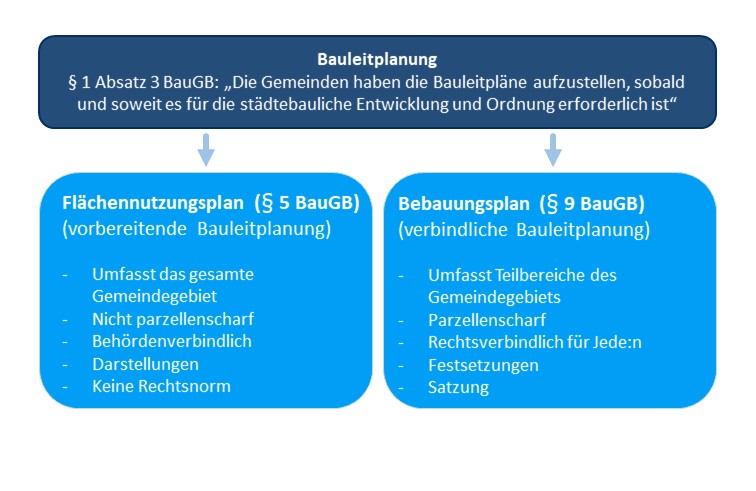 Die Städte und Gemeinden stellen in eigener Verantwortung (kommunale Planungshoheit) Bauleitpläne auf. Diese sind zu erarbeiten, wenn es für die städtebauliche Entwicklung und Ordnung erforderlich ist. Zu den Bauleitplänen gehört der Flächennutzungsplan (vorbereitender Bauleitplan) und der Bebauungsplan (verbindlicher Bauleitplan) – siehe Abbildung.