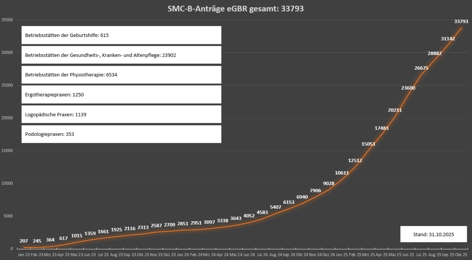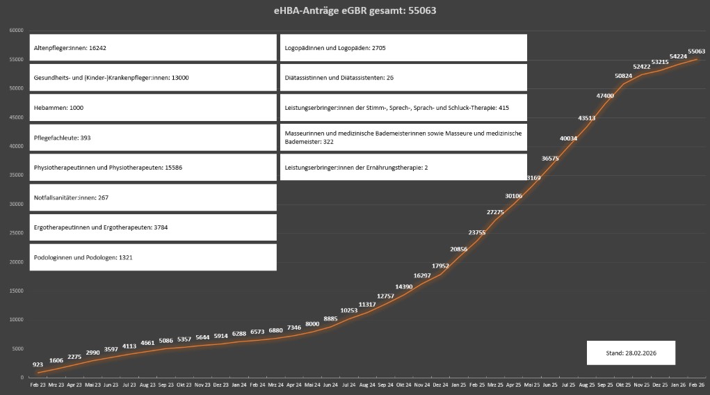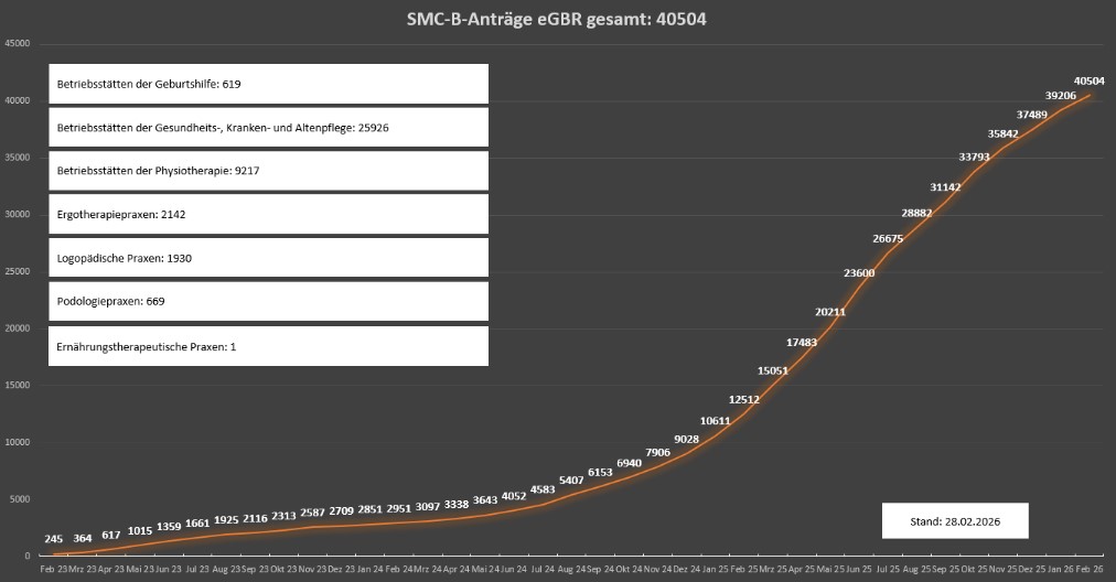 Im Sinne der Verwaltungstransparenz veröffentlicht das elektronische Gesundheitsberuferegister (eGBR) an dieser Stelle monatlich die aktuelle Entwicklung der beim eGBR eingegangenen Anträge. Diese werden hier aufgeschlüsselt nach Anträgen auf Herausgabe eines elektronischen Heilberufsausweises (eHBA) und Anträgen auf Herausgabe eines Institutionsausweises (SMC-B).