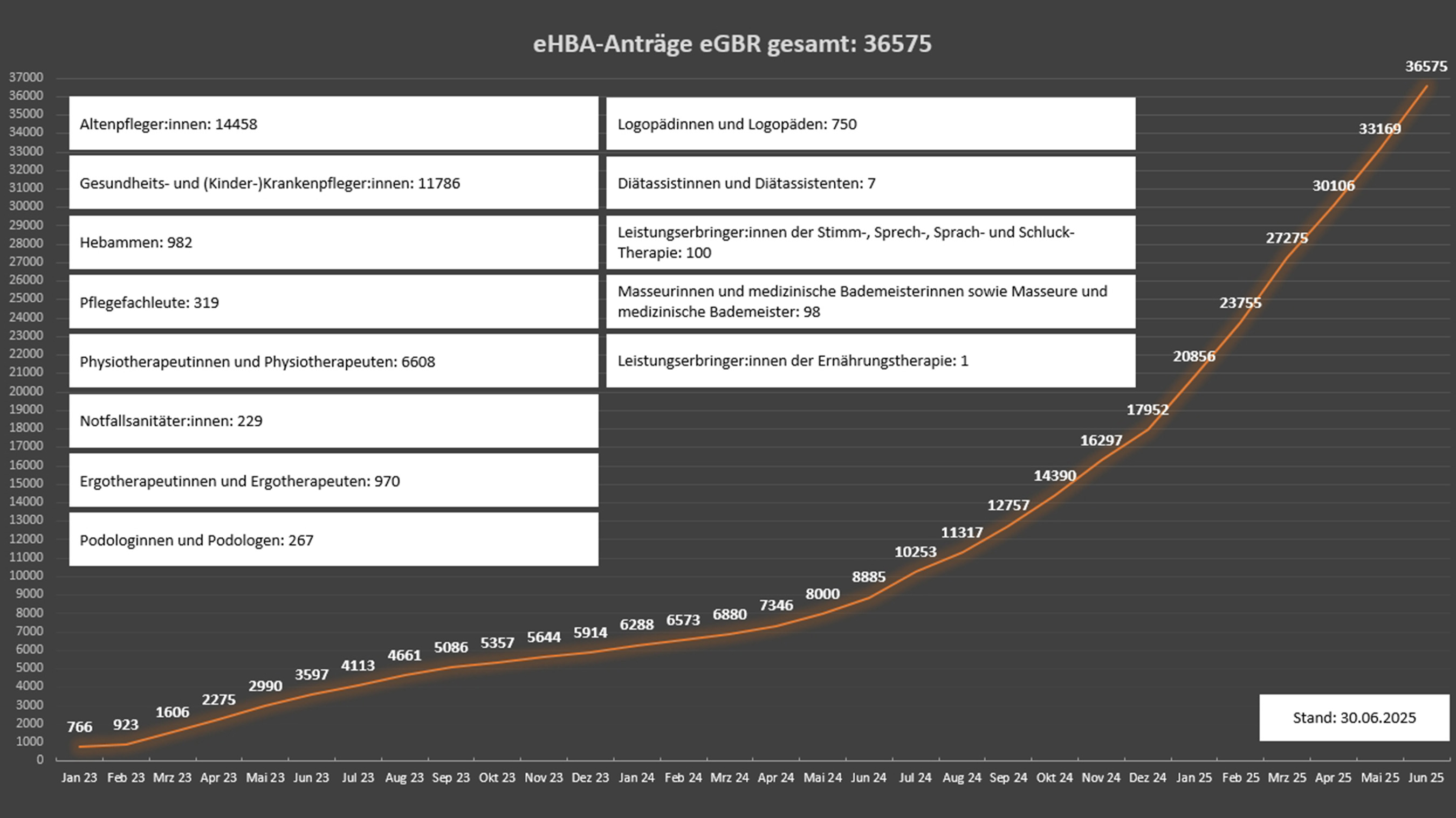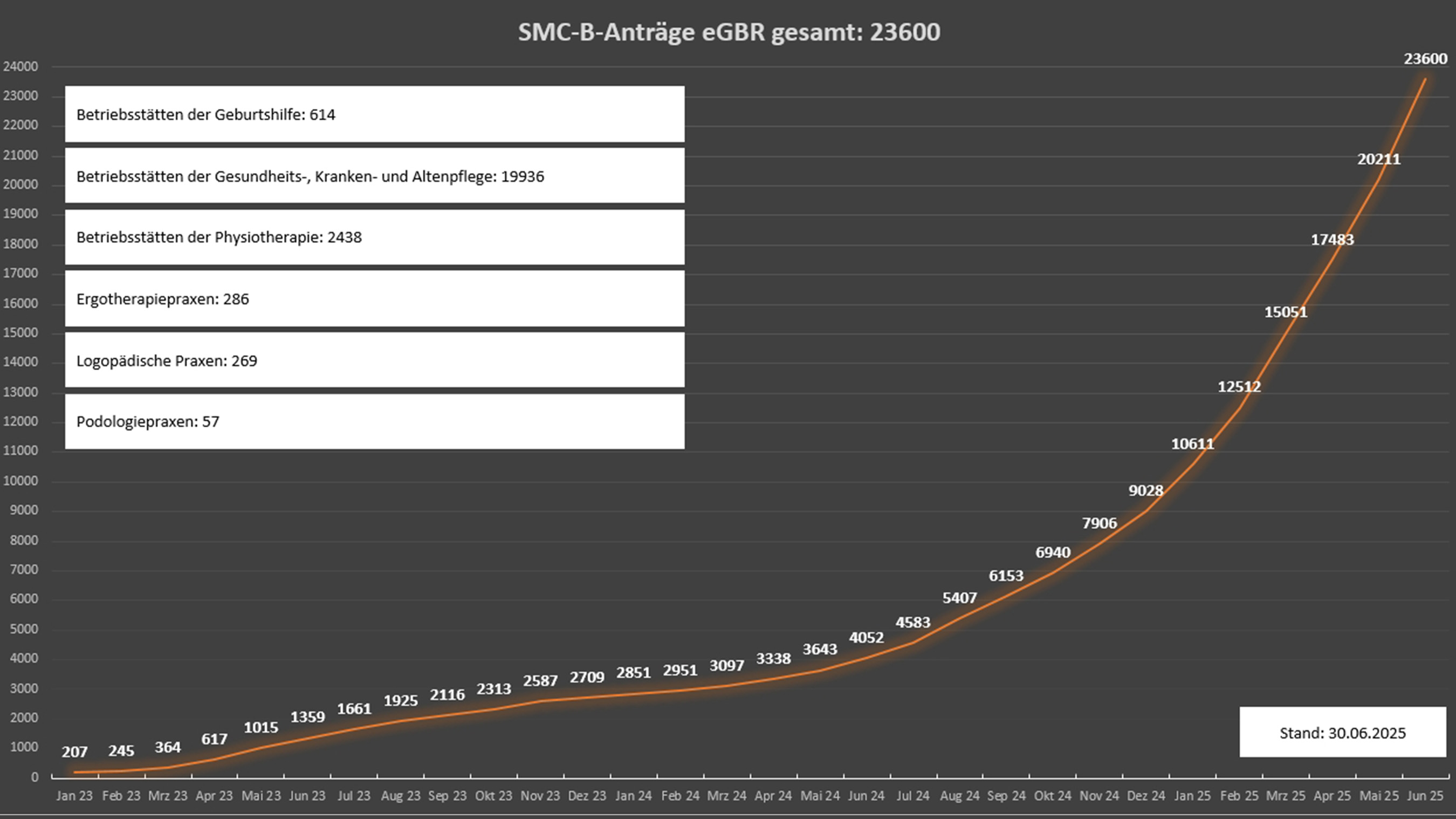 Im Sinne der Verwaltungstransparenz veröffentlicht das elektronische Gesundheitsberuferegister (eGBR) an dieser Stelle monatlich die aktuelle Entwicklung der beim eGBR eingegangenen Anträge. Diese werden hier aufgeschlüsselt nach Anträgen auf Herausgabe eines elektronischen Heilberufsausweises (eHBA) und Anträgen auf Herausgabe eines Institutionsausweises (SMC-B).