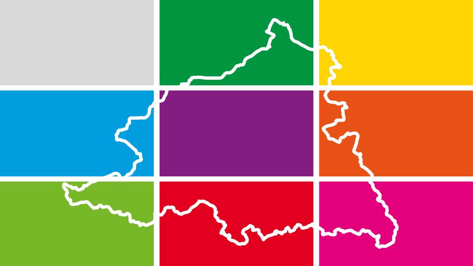 Logo mit bunten Kacheln und Umriss des Münsterlandes